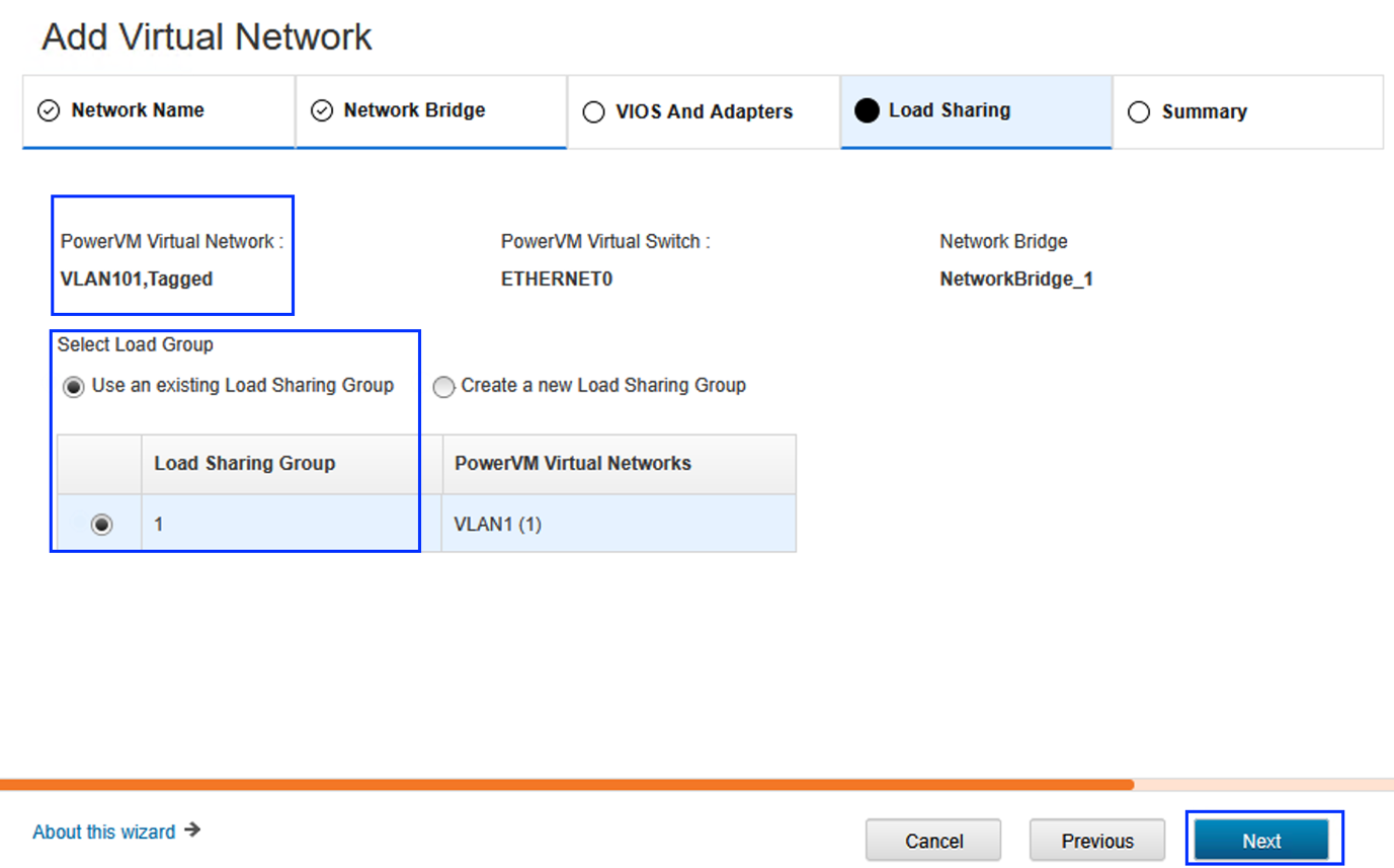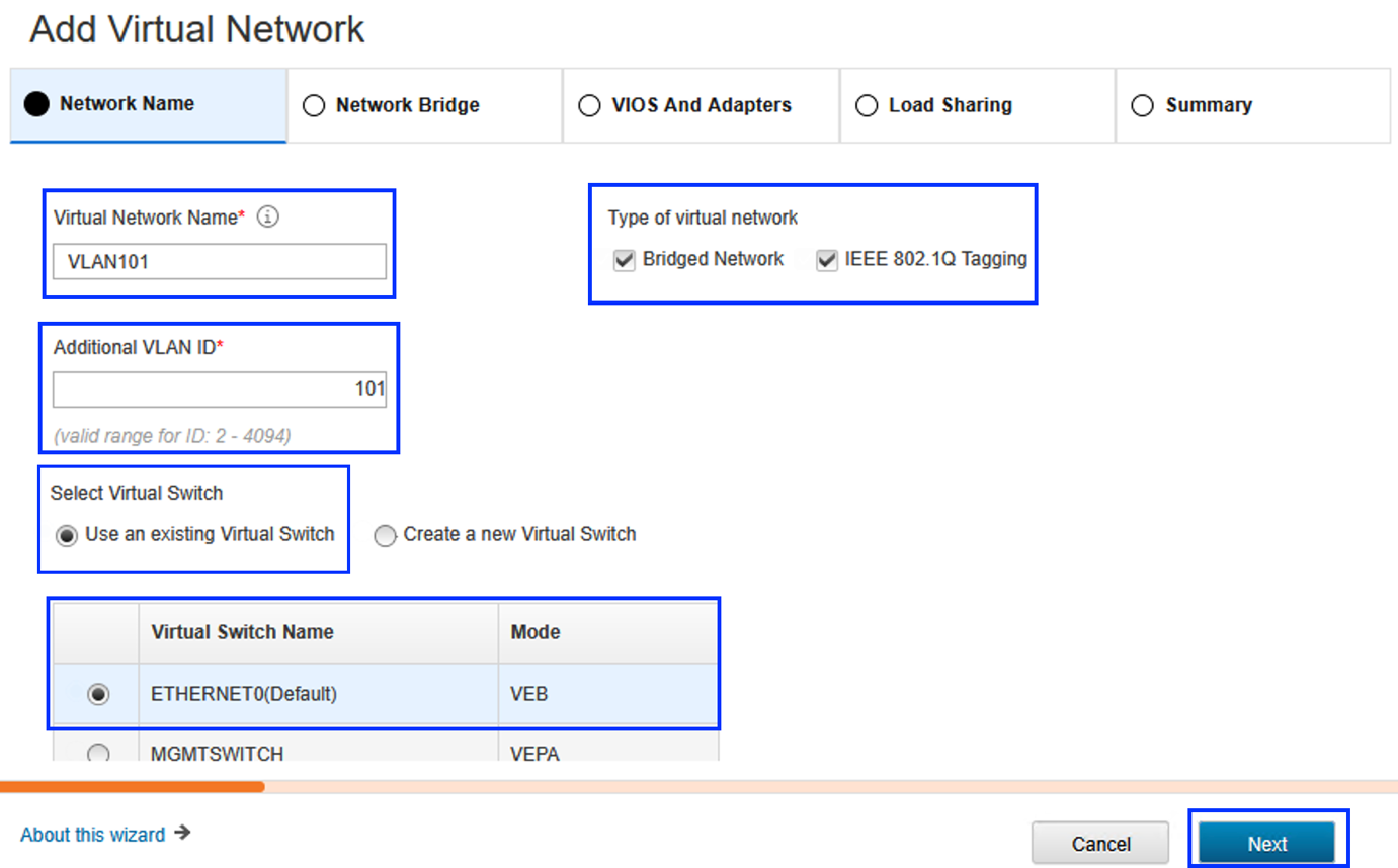 5. Enter a name for the Virtual Network Name. Ensure that both Bridged Network and IEEE 802.1G Tagging are both selected. Enter a VLAN ID (this is the VLAN ID that needs to be added to the existing SEA). In this example, we’re adding VLAN ID 101 as a tagged VLAN ID. Typically, for an existing SEA configuration, you should select Use an existing Virtual Switch, then select the Virtual Switch Name (typically ETHERNET0, the default), but yours may be different). Then select Next.