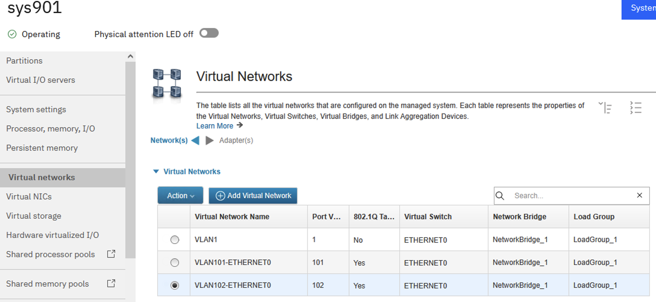 2. From the Virtual Networks view for the Power server. Select the Virtual Network (VLAN) you want to remove. In this example we want to remove VLAN102-ETHETNET0.