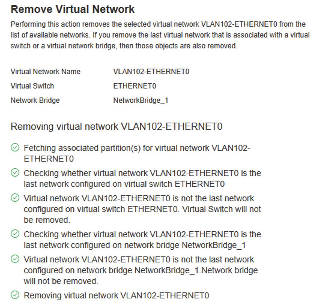 3. Select VLAN102-ETHERNET0. Select Action. Select Remove Virtual Network.